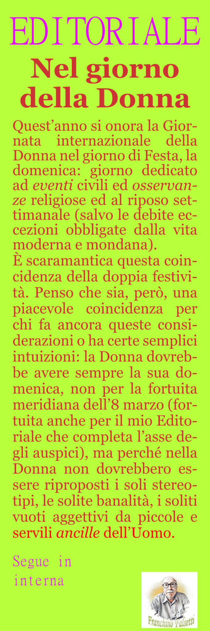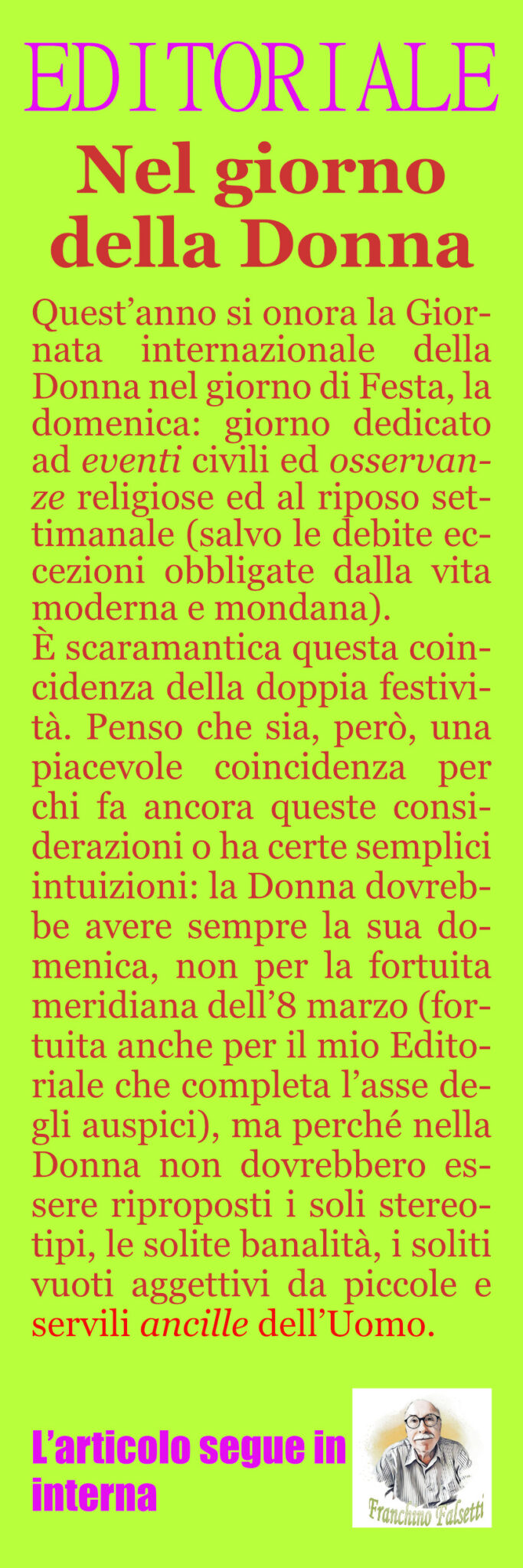 L’Editoriale Millecolline di Franchino Falsetti. “Nel giorno della Donna”