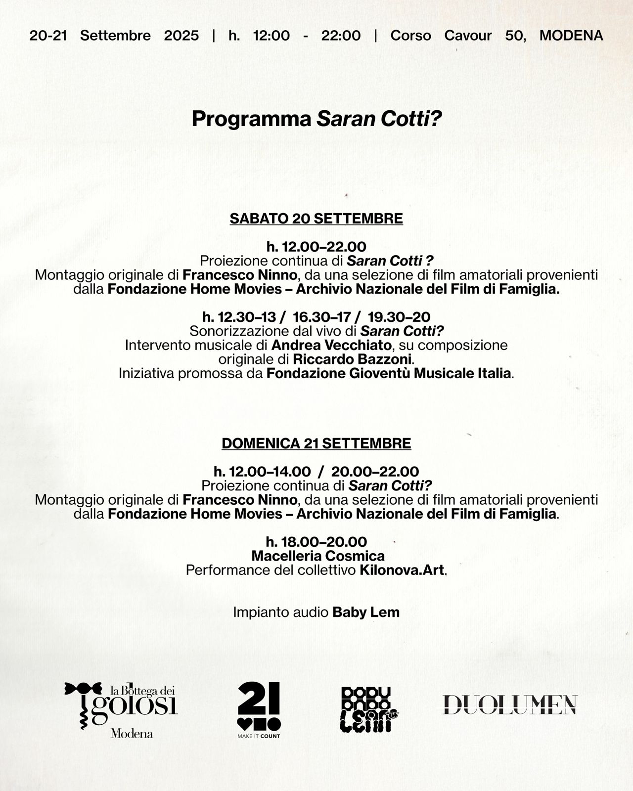 Saran Cotti? è realizzato con il sostegno di DuoLumen, 21 Make It Count, La Bottega dei Golosi e Gioventù Musicale d’Italia – Modena.