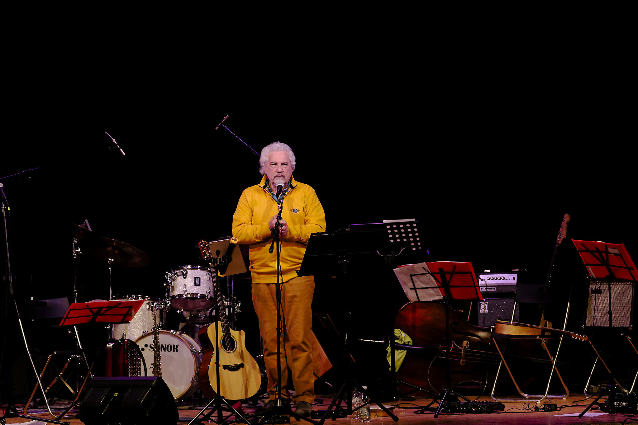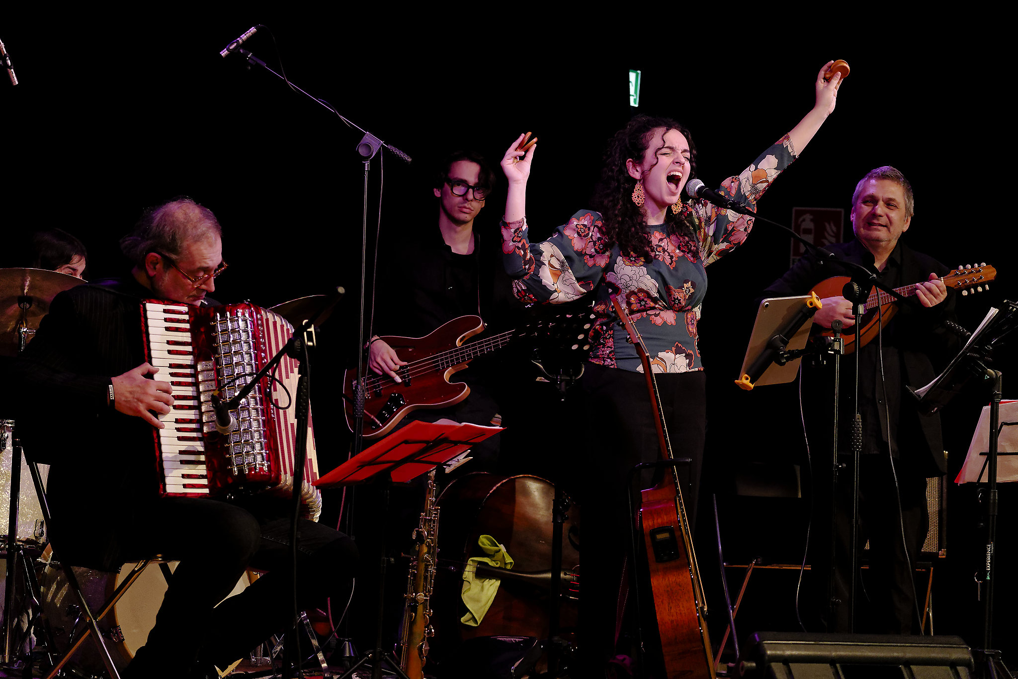 L’ensemble sul palco è stata diretta dal maestro Roberto Manuzzi che ha curato anche le composizioni musicali e gli arrangiamenti oltre a suonare sassofono, flauti e fisarmonica.