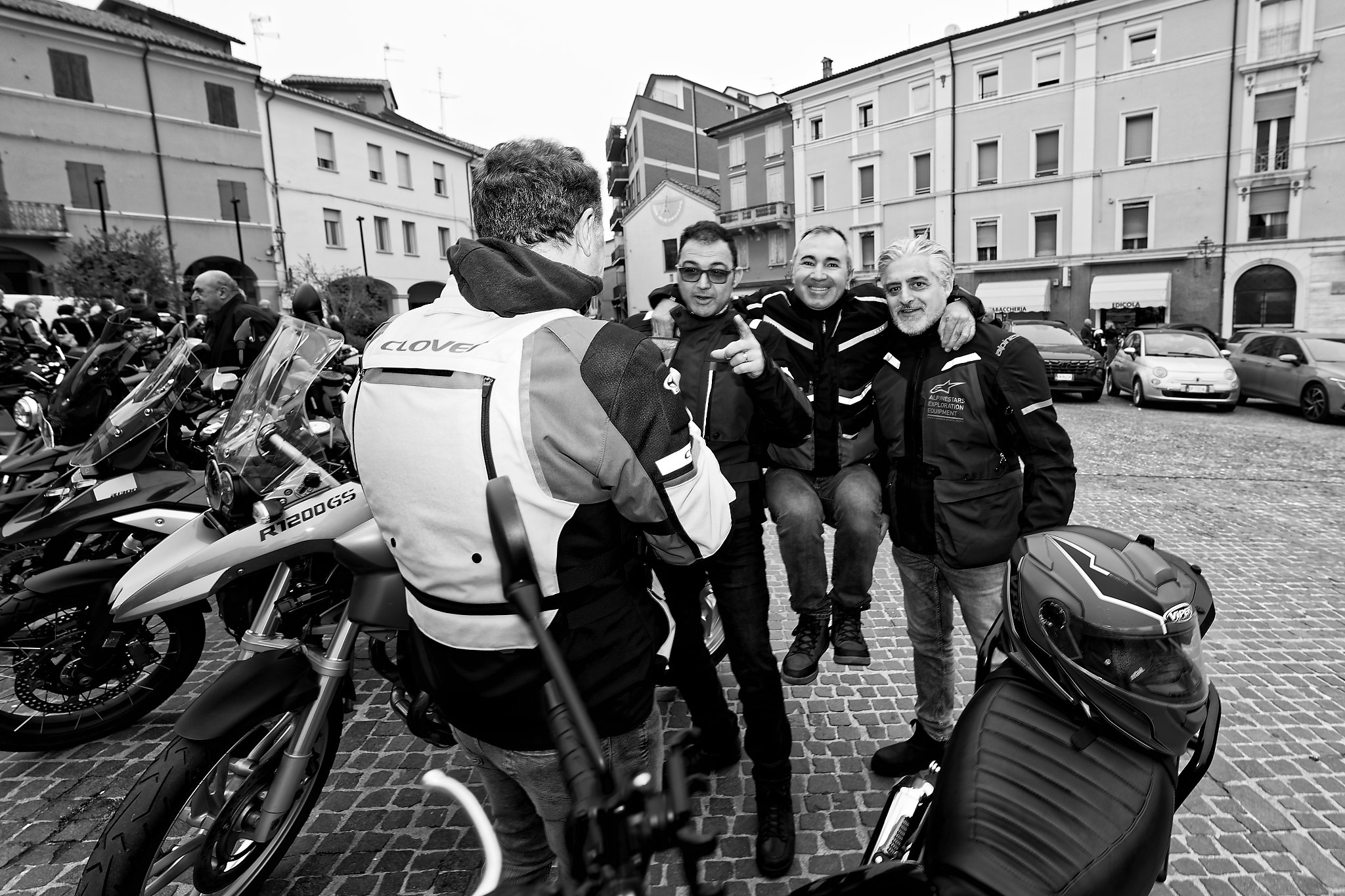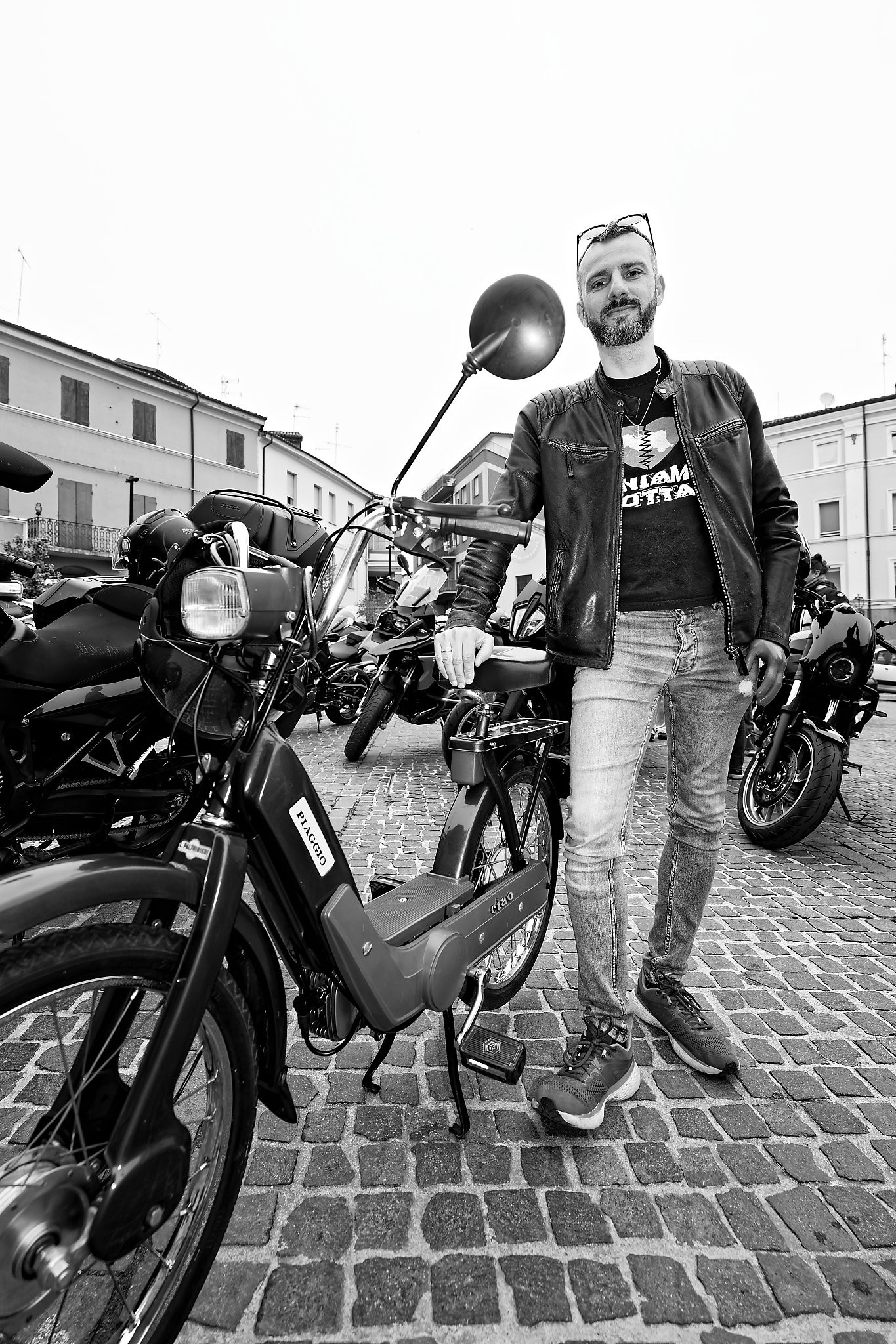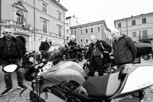 Ecco che vedo arrivare Don Tommaso; ormai è tutto pronto, la piazza è animata da moto di ogni cilindrata ma, fra alcuni “mostri” di potenza, non mi faccio sfuggire un Ciao Piaggio (grigio sfavillante) e neppure i “vespini” in leggero margine rispetto all’allineamento principale.