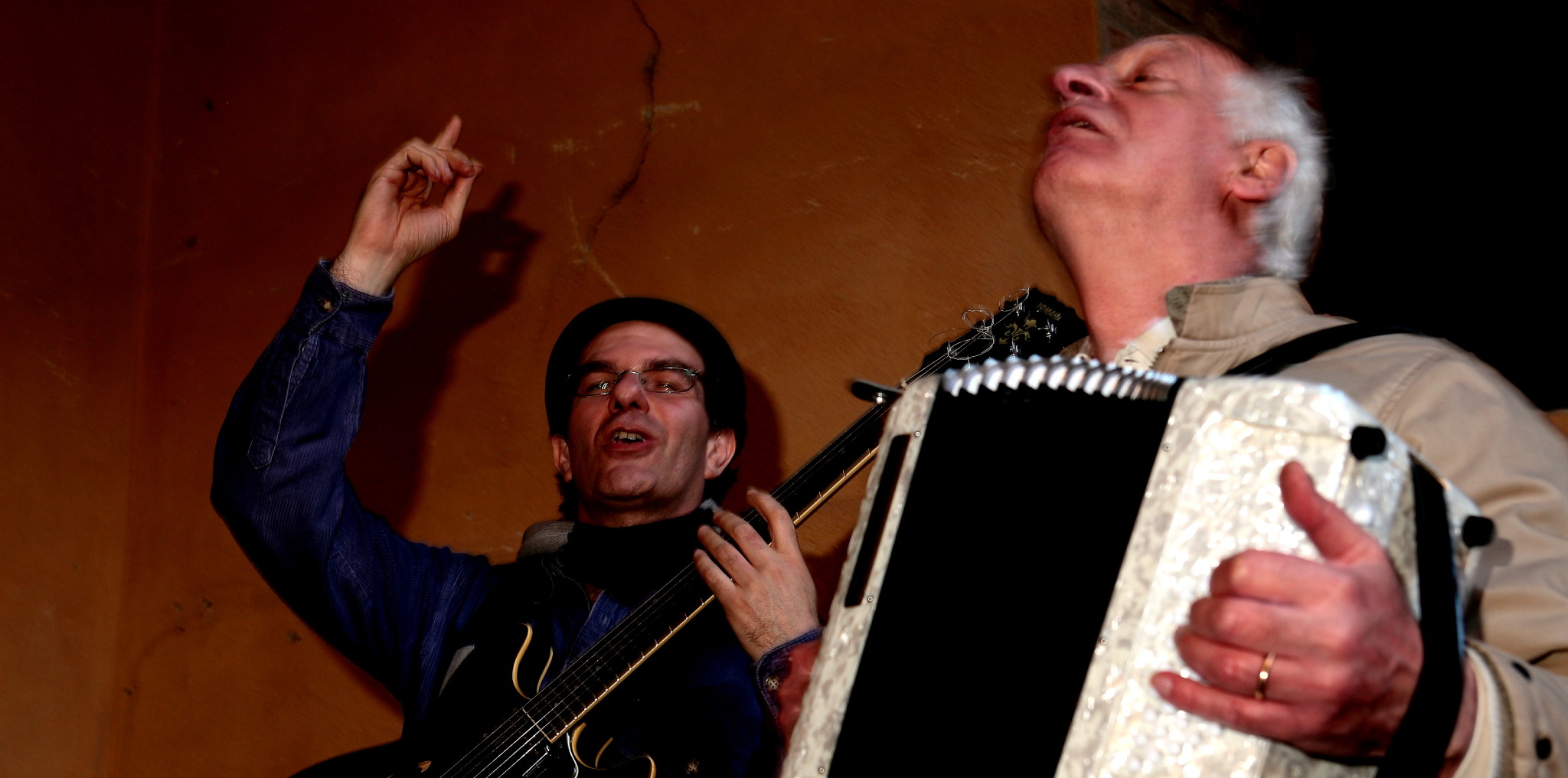 Renato Giorgi, in attesa dell’avvio di “Frédo al fràb” (Alfredo il fabbro) suona un brano con lo strumento che lo ha reso celebre in Valsamoggia: la foglia di gelso